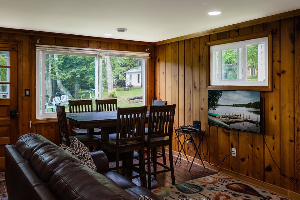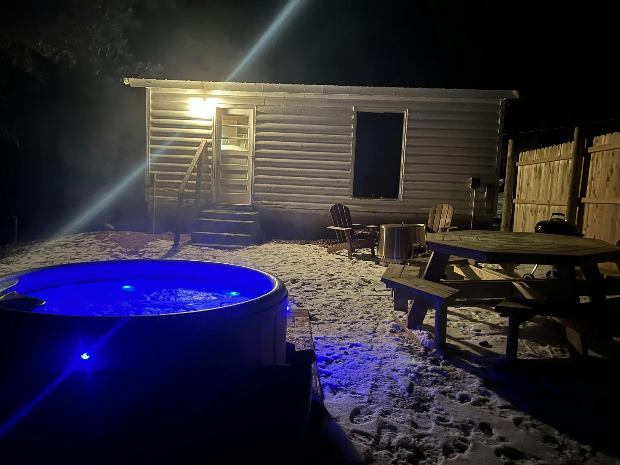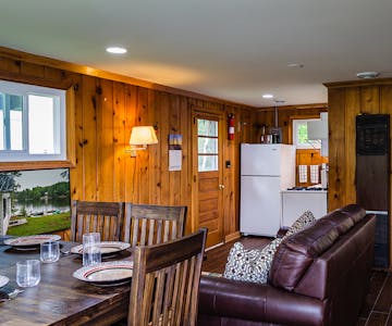 The most private andluxurious cottage being across from the others with a large window looking out to the lake. Enjoy sitting next to your fire in a hot tub while gazing at the lake and stars above. Two luxury queen mattresses in separate bedrooms wait for you at the end of a long day of adventure. Also includes a smart T.V with free Wi-Fi, hard ceramic flooring dining area, a complete kitchen with utensils, cooking/dinner/silverware included. A bathroom featuring large vanity, a rain-like shower head and hand-held with endless hot water. Can sleep a maximum of 5 people comfortably with linens and towels provided. A rollaway bed can be added upon request. Comes with a personal motorized row boat and dock. Only minutes from the Up North lodge with delicious food, full bar and special events.